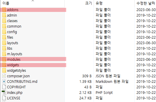 Like the picture above if you see folders like /addons, /modules, and /widgets, you're in XpressEngine's top (root) directory. Finding this main folder is important