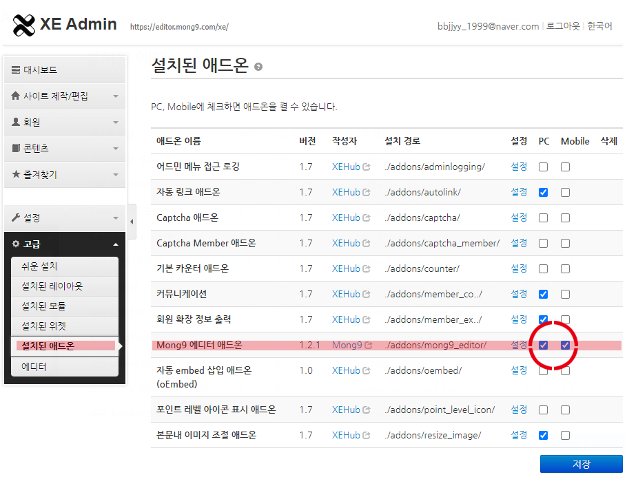 3. Administrator Mode > Advanced > Installed Add-ons > Check PC and Mobile for Mong9 Editor Add-on, then save.